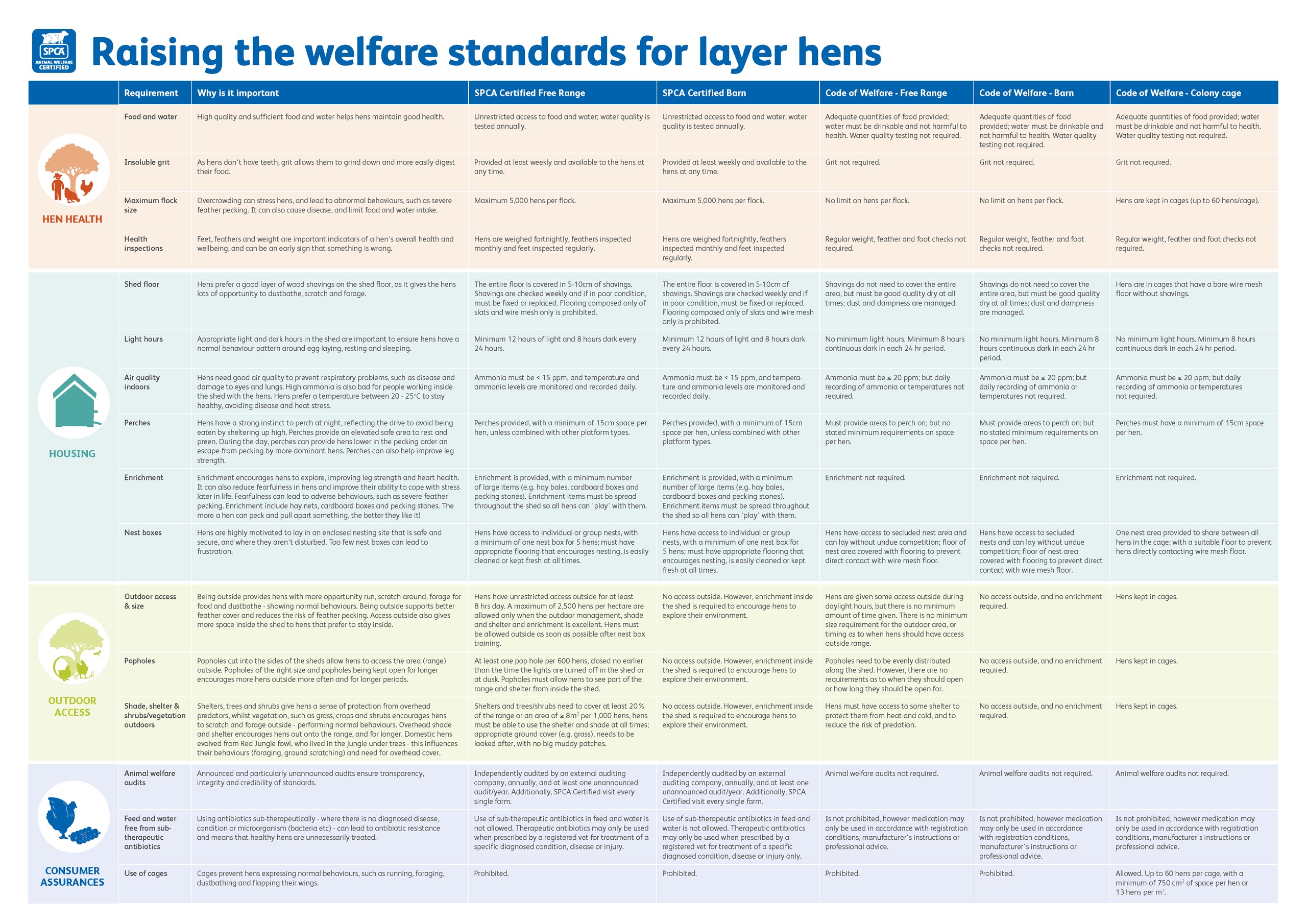 At SPCA Certified we believe in making it easier for consumers to know what they are buying and how to support better welfare. The infographic below compares requirements for hen welfare in terms of hen health, housing, outdoor access, and consumer assurance in the Minimum Standards and SPCA Certified standards for the different farming systems.
