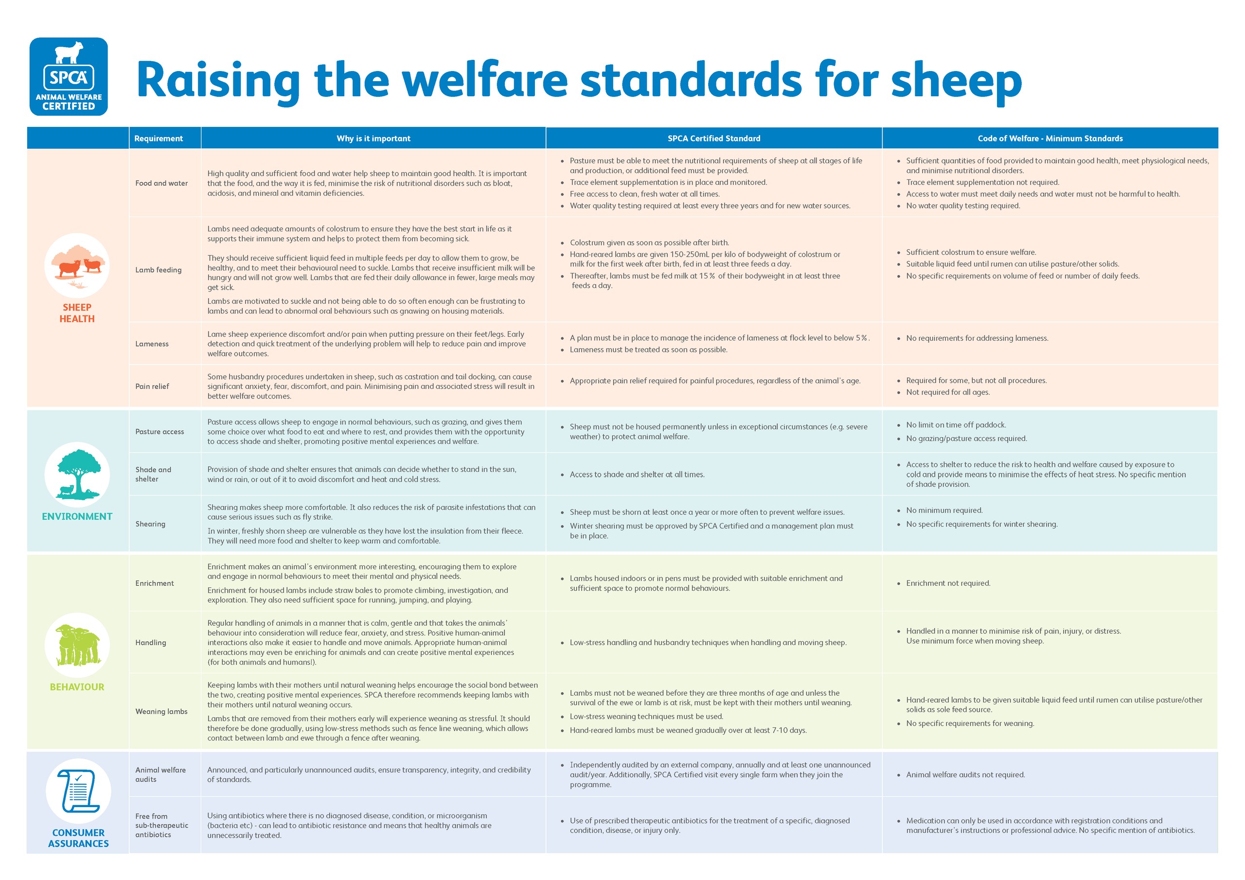 At SPCA Certified we believe in making it easier for consumers to know what they are buying and how to support better welfare. The infographic below compares welfare requirements for sheep under the Code of Welfare and SPCA Certified standards. See how the different standards compare in terms of sheep health and behaviour, access to pasture and shade and shelter, and consumer assurances for how sheep are farmed.