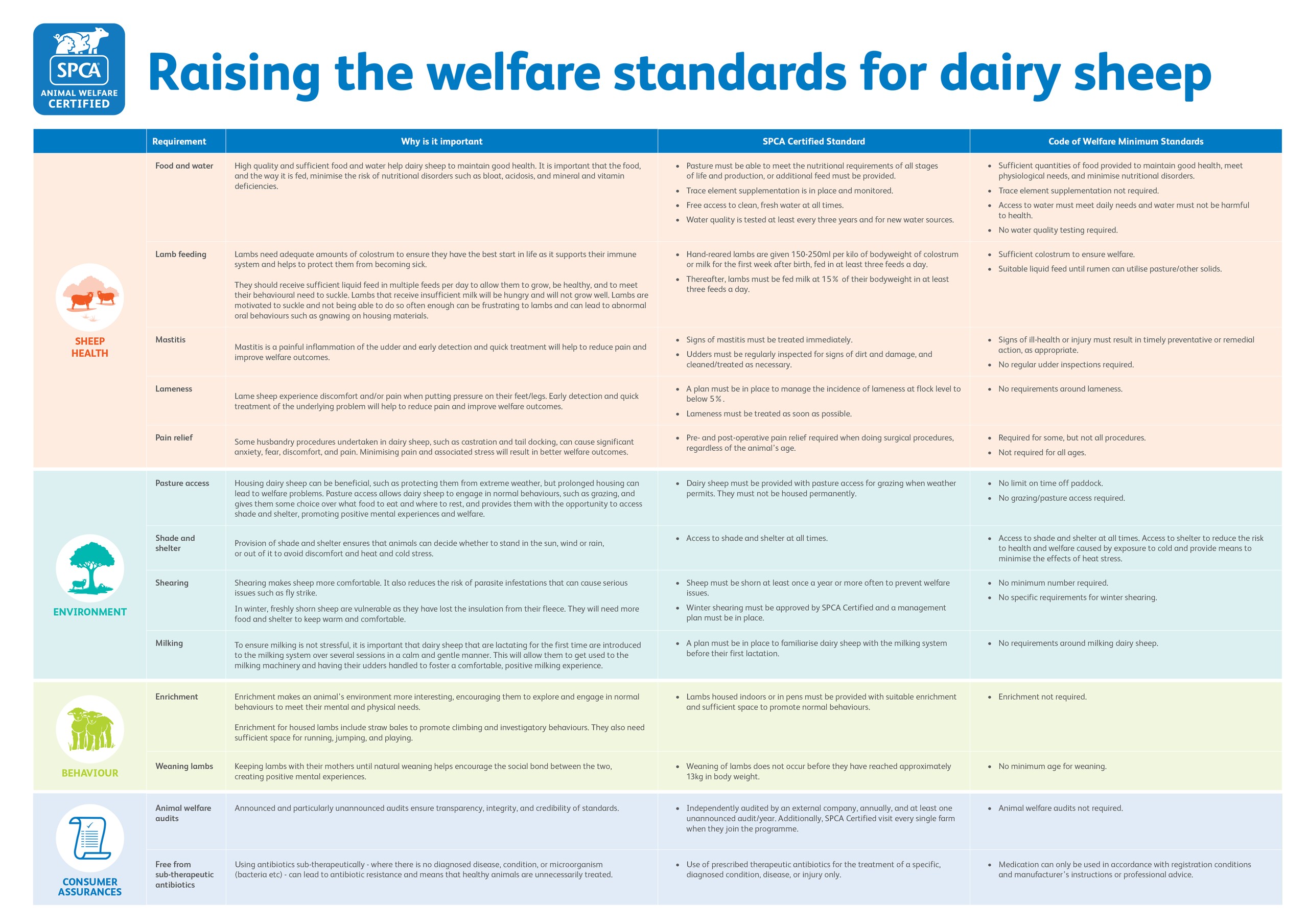 At SPCA Certified we believe in making it easier for consumers to know what they are buying and how to support better welfare. The infographic below compares welfare requirements for dairy sheep under the Code of Welfare and SPCA Certified standards. See how the different standards compare in terms of dairy sheep health and behaviour, access to pasture and shade and shelter, and consumer assurances for how dairy sheep are farmed.